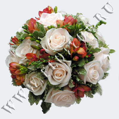 Круглый букет невесты с кремовыми розами и терракотовой фрезией.