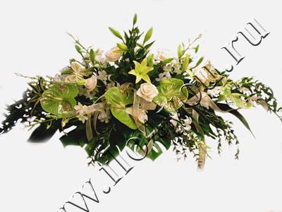 Большая напольная композиция рядом со столом жениха и невесты в золотисто-зеленой гамме.