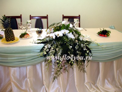 Композиция на стол жениха и невесты из белых орхидей.