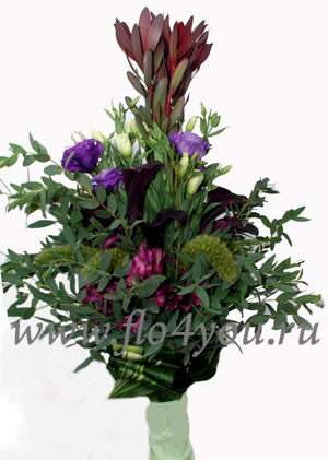 Стильный вертикальный букет с черными каллами и фиолетовым лизиантусом