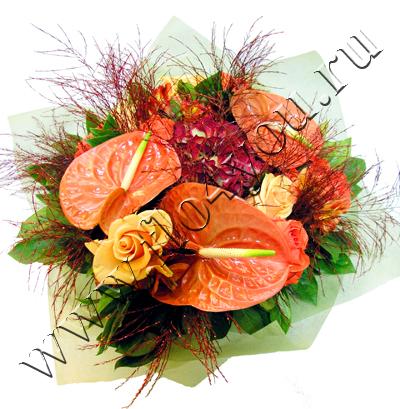 Новогодний букет с антуриумами и декоративным цветным аспарагусом.