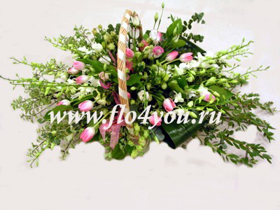 Большая корзина с орхидеей Дендробиум, розовыми тюльпанами и декоративной зеленью.