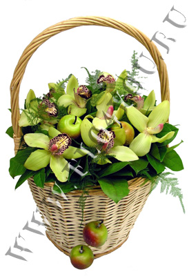 Зеленая орхидея и яблоки — неожиданное сочетание, придающее необыкновенный шарм этой композиции.