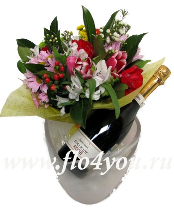 В состав композиции входит кулер для вина, букет цветов. Стоимость вина не включена. Его Вы можете выбрать на свое усмотрение.