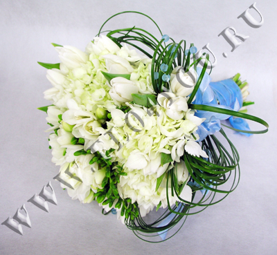 Букет выполнен без портбукетницы. Ножка задекорирована голубой лентой, используютя голубые бусинки. Цвет декора можно изменить по желанию. Примерный диаметр 22-23см.