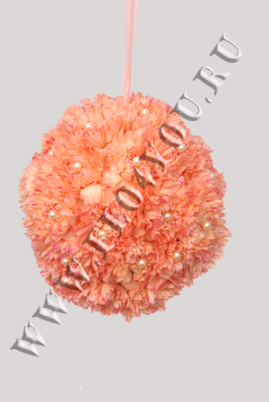 Букет выполнен в виде шара с атласной ленточкой, которая одевается на руку невесты, декор - бусинки. Примерный диаметр 23см.