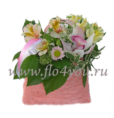 В маленькой розовой сумочке собралось много цветов. Композиция дополнена бантом из атласных лент. Примерные размеры изделия 15*20см.