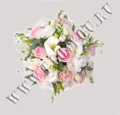 Круглый букетик из розовых роз и белоснежного лизиантуса.