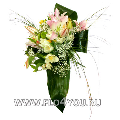 Оригинальный букет из лилии и тюльпанов с аспидистрой.