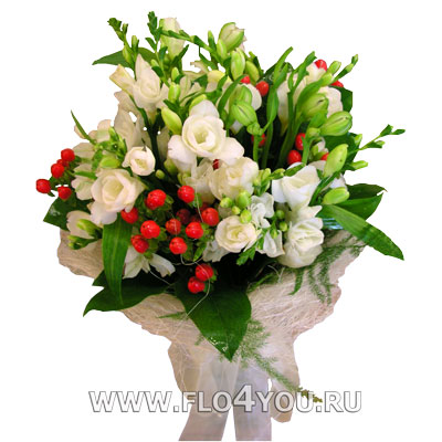 Букет из белой фрезии на каркасе из сизаля.