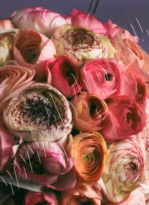 Необычный букет-конус из ранункулюсов и декоративной зелени. Детали.