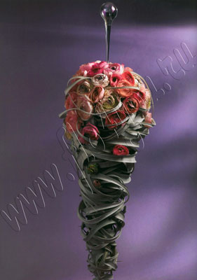 Необычный букет-конус из ранункулюсов и декоративной зелени.