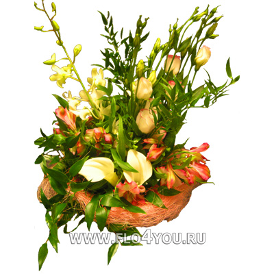 Основные цветы: лизиантус, альстромерия, дендробиум, кала, декоративная зелень