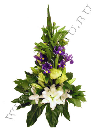 Основные цветы: лилия, розы, ирисы, декоративная зелень.