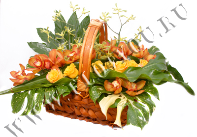 Необычная композиция из экзотических цветов и зелени.