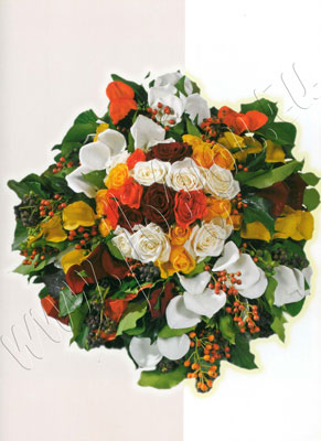 Букет невесты в кремово-персиковой гамме. Яркость и значимость букету придает бордовая роза. Необычность - лепестки роз, приклеенные к зелени.