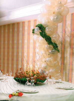 Оформление интерьера, цветами, шарами и зеленью.