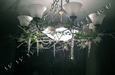 Люстра украшена заснеженным корнусом, золотым салексом и живыми орхидеями.