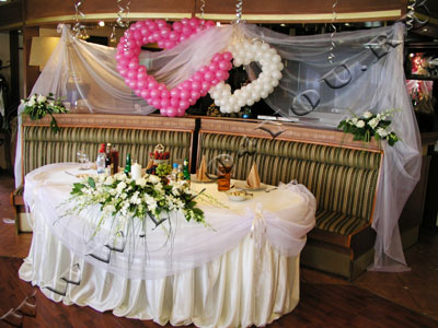 Декор выполнен из 2-х тканей в молочно-белой гамме. Цветовая гамма может быть изменена по желанию. Стоимость цветов не включена в данное оформление. Длина стола 3,5м, ширина 1,2м.