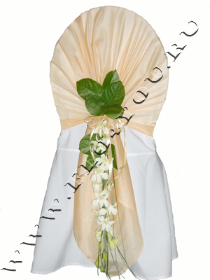 В стоимость оформления входит: прокат белого чехла, шапочка на спинку стула (цвет можно выбрать по желанию), бутоньерка из орхидеи и зелени.