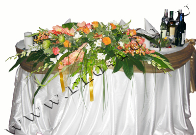 В стоимость оформления входит скатерть с юбкой белого цвета, оформление золотой тканью. Диаметр стола 150см.