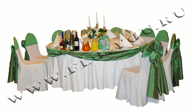 В стоимость оформления входит: отделка скатерти тканью 1-го вида (цвет может быть изменен по желанию). Скатерть не входит в стоимость оформления. Диаметр стола 150см.