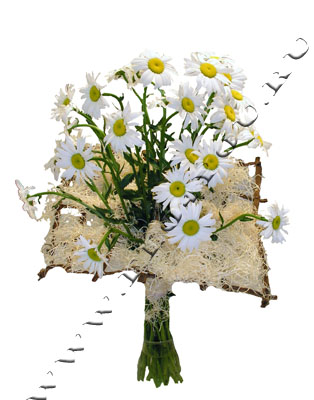 Букет из настоящих ромашек выполнен на каркасе из натуральных материалов.