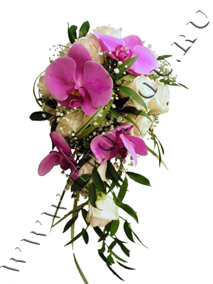 Выполнен на портбукетнице из кремовых роз сорта Вендела, орхидеи фаленопсис, с добавлением гипсофилы и декоративной зелени.