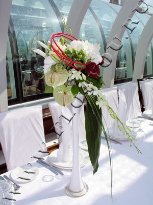 Композиция на столы гостей в высоких стеклянных вазах с наполнителем.