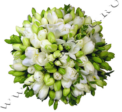 Прекрасный свадебный букет собран из нежных бутонов фрезии и украшен атласной лентой.