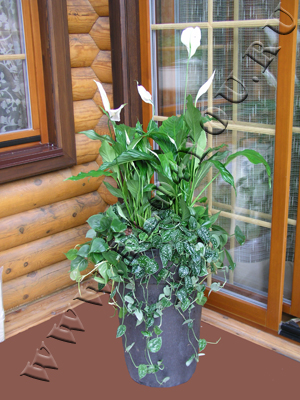 Композиция из горшечных растений в высоком керамическом кашпо с грунтом и дренажом.