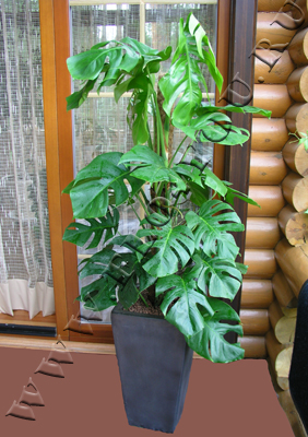 Монстера в высоком керамическом кашпо с грунтом и дренажом.