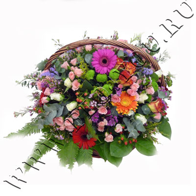 Яркая летняя корзина с герберами, розами и кустовой хризантемой.