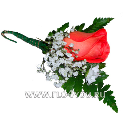 Бутоньерка из огненной розы сорта Сиокс, гипсофилы и декоративной зелени.