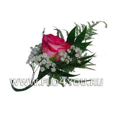 Бутоньерка из ярко-розовой розы с добавлением гипсофилы и декоративной зелени.