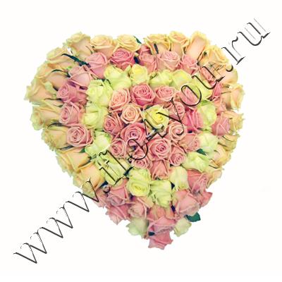 Сердце из 79 роз нежно-кремового, белого и розового цвета. Примерный размер 37*45см.