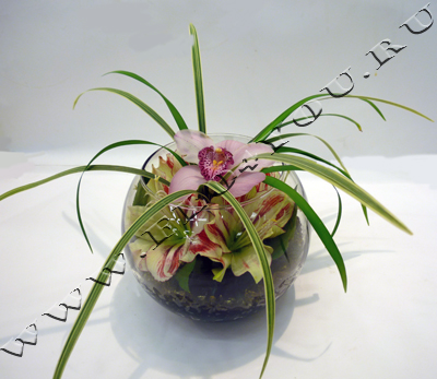 Композиция выполнена в стеклянной вазе с использованием геля, гипеаструмов, орхидеи Цимбидиум, декоративной зелени.
