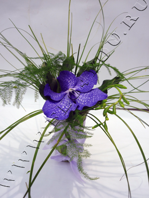 Композиция выполнена в стеклянной вазочке с использованием орхидеи Ванды и декоративной зелени. Примерные размеры: диаметр 10см, высота 20см.