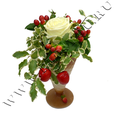 Комозиция выполнена в вазочке "Вафельный рожок" с использованием белой розы, красного гиперикума, декоративной зелени, искусственных вишенок. Примерные размеры: диаметр 15см, высота 20см.