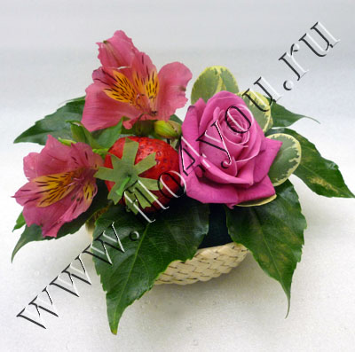 Композиция в плошке с добавлением искусственной клубники. Примерный диаметр 10см. При заказе 300 шт. и более с доставкой в одно место стоимость данной композиции будет составлять 450 руб.