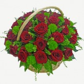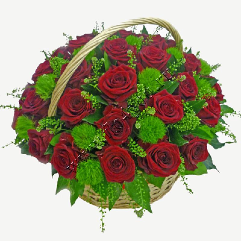 Классическая корзина из бордовых роз с добавлением насыщенной декоративной зелени.