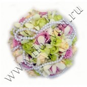 Букет собран на портбукетнице. Декор - белые бусы. Примерный диаметр 22-23см.