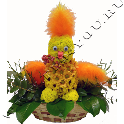 Выполнен из кустовой хризантемы разных сортов и украшен перьями. Высота композиции 30-35см.