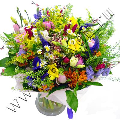 Большой круглый букет из полевых цветов поражает своей необычностью и многосложной цветовой гаммой.