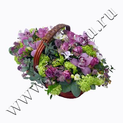 Очень необычная корзина розово-сиреневого оттенка с добавлением голубой и салатовой зелени.