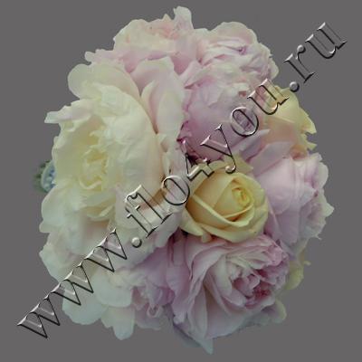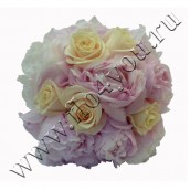 Ножка задекорирована красивой атласной лентой. Количество пионов варьируется от 11 до 15 шт. в зависимости от размера цветка. Примерный диаметр букета 22-23 см.