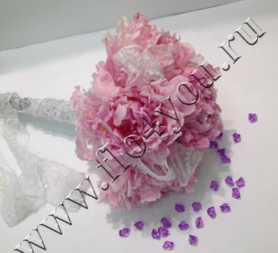 Букет украшен белой лентой с бусинами и пайетками.