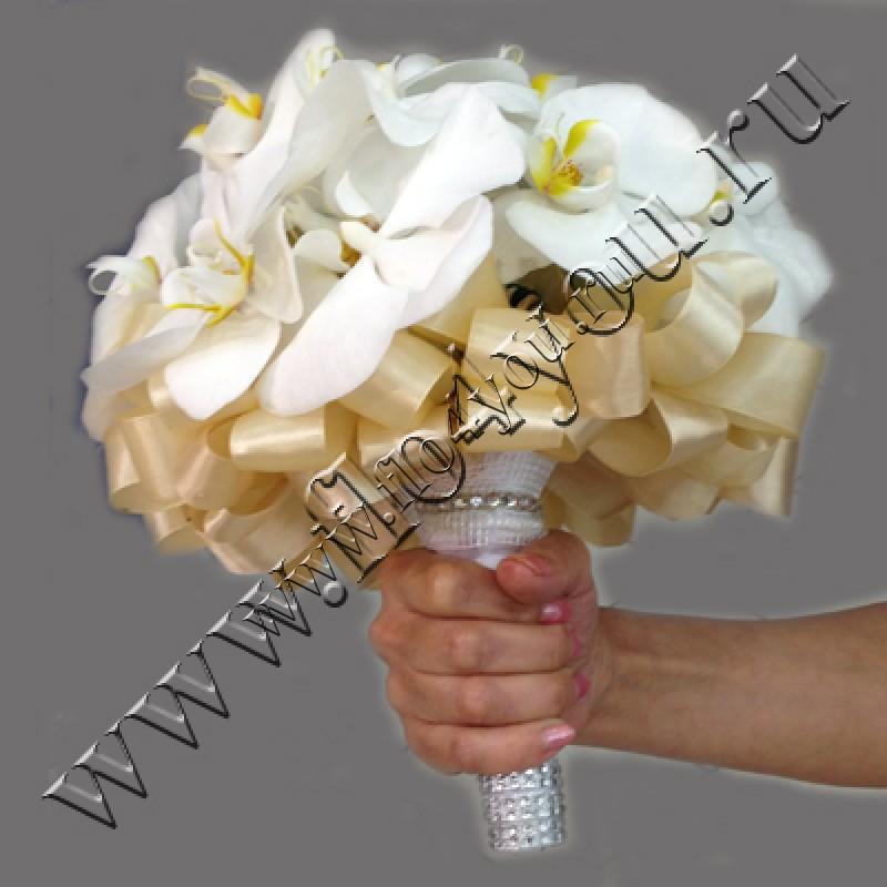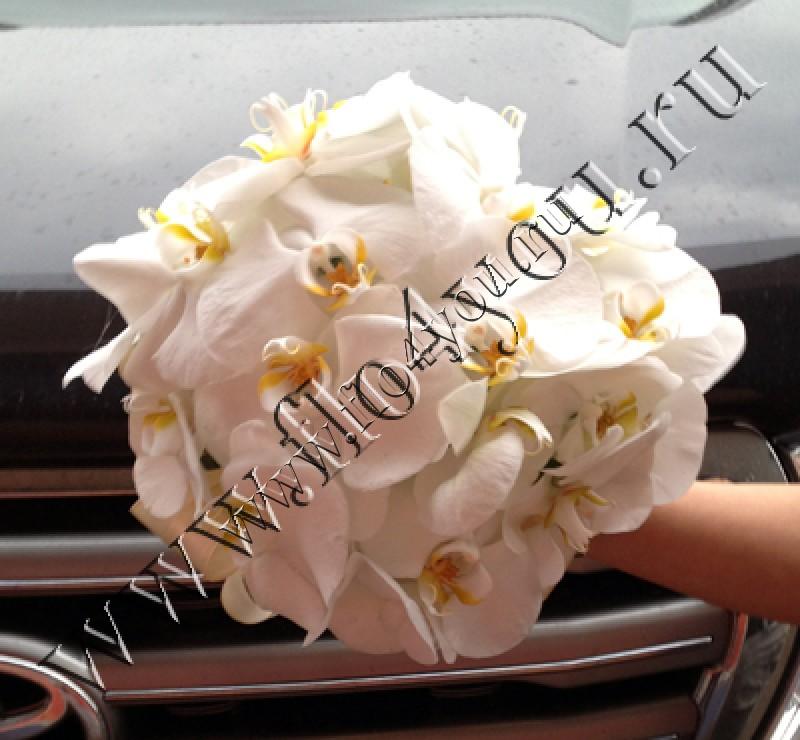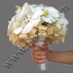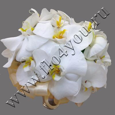 Круглый свадебный букет из белоснежной орхидеи Фаленопсис.