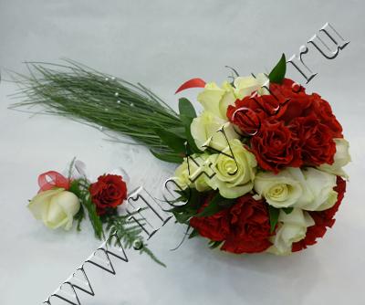 Букет собран на портбукетнице. Ручка задекорирована беарграссом с бусинками.