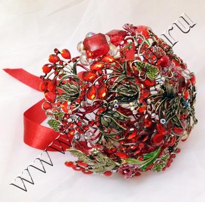 Букет невесты из брошей и камней алого цвета для яркого и незабываемого торжества.